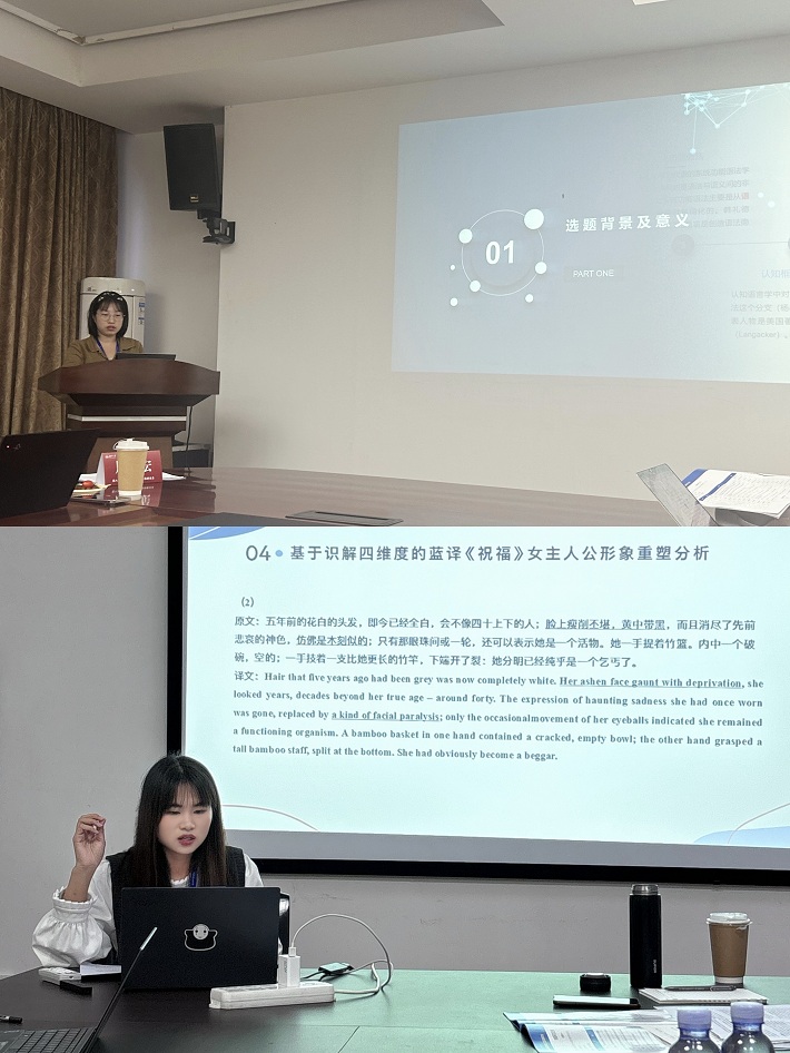我院师生在会议的专题论坛上分享了关于“林学学术英文期刊中名词化的认知语法分析”与“蓝译《祝福》中祥林嫂形象重塑的认知探讨”等为主题的学术论文,并深入探讨了林学英文学术论文中的名词化现象及其在学术写作中的功能、译者的识解方式如何通过重塑人物形象影响翻译中文化传播的效果等内容。分享内容获得了与会专家、学者的一致肯定。
