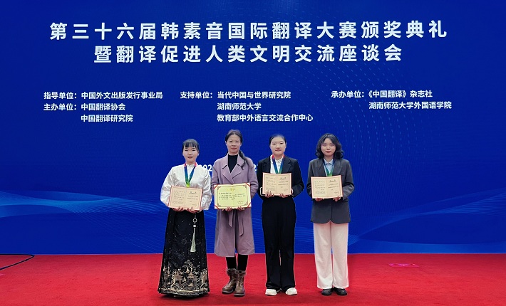 11月23日,第三十六届韩素音国际翻译大赛颁奖典礼暨翻译促进人类文明交流座谈会在中国外文局举行,我校获奖选手代表及带队老师参加了颁奖典礼和座谈会。在今年的韩奖赛事中,我校学子创下了历史性佳绩:外国语学院朝鲜语专业再创佳绩,2021级佘盼盼获得朝译汉二等奖,2021级孟菁悦获得汉译朝三等奖,2021级王鑫获得朝译汉优秀奖;日语专业首创佳绩,2021级朱呈琳获得日译汉二等奖,2022级楚玉莹、2921级尹妍获得日译汉优秀奖;翻译专业和大学外语继续保持往年的成绩,2021级胡博淏和2022级单立奇分别获英译汉优秀奖;俄语专业研究生23级曹孟霞、秦洋洋获俄译汉优秀奖;我校继2020年以来第四次荣获“最佳组织奖”。
