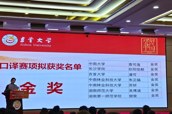 11月1日至3日,由湖南省教育厅主办,吉首大学承办的2024年外研社•国才杯“理解当代中国”湖南省大学生英语能力大赛中,我校代表队精心组织,全力以赴,在各个赛项中表现优异,取得好成绩:获得金奖4项,银奖6项,铜奖6项,并获得团体银奖。