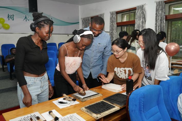活动中,留学生纷纷上台,以饱满的热情向在场的老师和同学们介绍各自国家的秋季节日习俗,并展示具有自己祖国特色的手工艺品和食品,为在场师生带来一场文化盛宴。外国语学院李键老师用中英文朗诵了苏轼的《水调歌头》。体育与音乐学院唐立英老师为大家进行了“秋思”主题茶艺表演,并介绍了中国茶礼。来自外国语学院的朱思睿和埃塞俄比亚的艾力担任主持人,详细讲解了中秋节的起源、历史背景和传统习俗。现场传统手工艺体验活动精彩纷呈:手制书法书签、活字印刷、猜灯谜、投壶等活动引发了现场参与者的极大兴趣。师生共同手工制作月饼,为活动增添了节日喜庆气氛。活动全程,大学生幽兰茶文化协会志愿者身着汉服,为参加活动的师生奉茶,师生们品鉴了不同茗茶,深刻感受了中国茶文化的魅力。