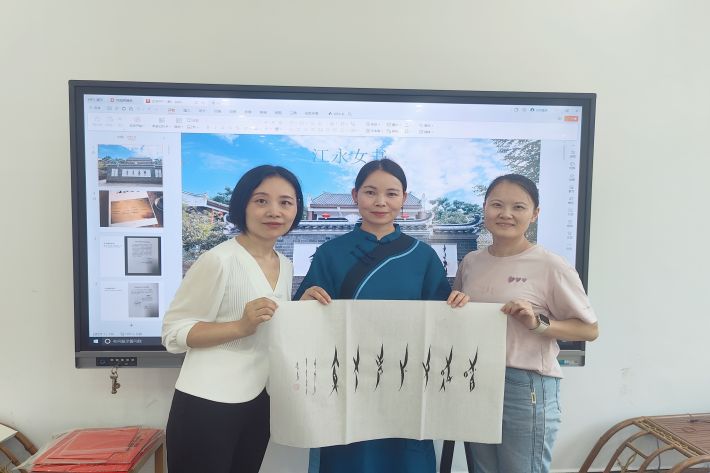 活动中,女书传承人胡欣和李爱莲两位老师为志愿者们上了一堂生动的女书文化课,展示了她们精湛的技艺和深厚的学识;学生们不仅领略了女书的独特魅力,还见证了胡欣老师用女书为我校“湖湘文化英语说”课程题词的难忘时刻,现场感受传承人一笔一划间对青年学子弘扬非遗文化的殷切期望。“湖湘文化英语说”是我院大学英语二部开设的一门特色通识课程,旨在通过英语这一国际语言的桥梁,引领学生深入探索,让学生在跨文化交流中能够自信地讲好湖南故事,传递湖湘文化的独特魅力和深厚底蕴。