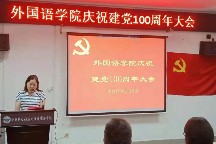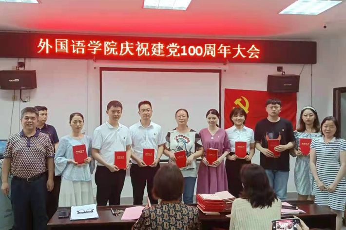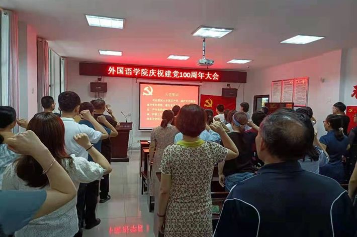 庆祝建党100年,起航时代新征程。6月29日,外国语学院党委在知语楼102隆重举行庆祝建党100周年大会。会议由党委副书记张学兵主持,党委书记李鹏飞讲话,院长张沉香宣读表彰决定,学院全体教工党员以及获奖学生党员参加。