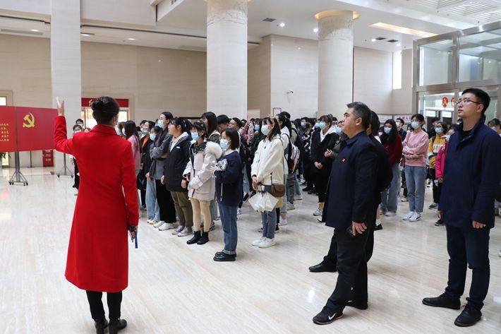 在陈列馆内,大家举起右手,在庄严肃穆的党旗前,重温入党誓词,再次以铮铮的誓言向党宣誓,坚定有力的宣誓声响彻整个馆内,激发了一名共产党员的使命感与责任感。