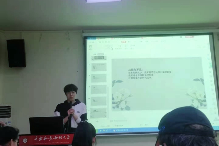 第二位主讲人是刘子崟同学。她从翻译的本质出发,讲解了翻译的性质和属性,强调了翻译的社会性。她表示:卢曼是德国当代最富创见的社会学家之一,他的社会系统论为翻译研究提供了丰富的概念工具和独特的理论视角。本文从社会翻译学出发,根据卢曼的社会系统理论,以葛浩文所译《红高粱家族》为例,解释卢曼的自我创生概念并应用于翻译研究中,以期为社会翻译学的发展提供参考与启示。