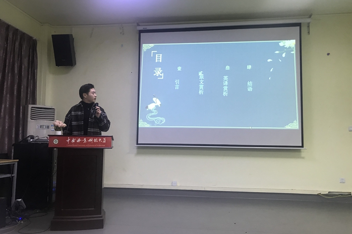 第三位主讲人欧宇航的主题是:《醉翁亭记》英译赏析—以罗经国和H.A.Giles的译本为例。他主要对比分析了《醉翁亭记》罗经国和Herbert A. Giles的英文译本,来发现他们的闪光与失彩之处,进而了解到中西译者在进行中国典籍翻译上处理方法的不同。