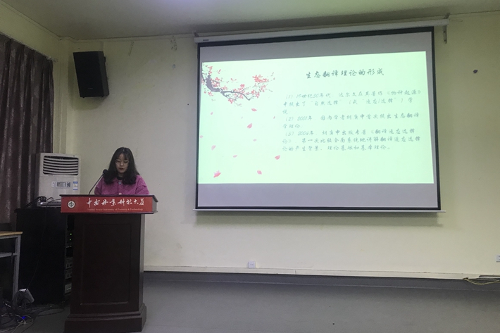 第一位主讲人弓玉的主题是:生态翻译理论视阈下的“译者中心论”—《如梦令·昨夜雨疏风骤》英译本探讨。她选取了宋代著名女词人李清照《如梦令·昨夜雨疏风骤》的两个英译本为研究目标,从生态翻译学理论中的“译者中心论”角度出发,通过分析两译本存在差异的主要因素,旨在更大程度地挖掘译者在诗词]英译过程中的主动性因素。