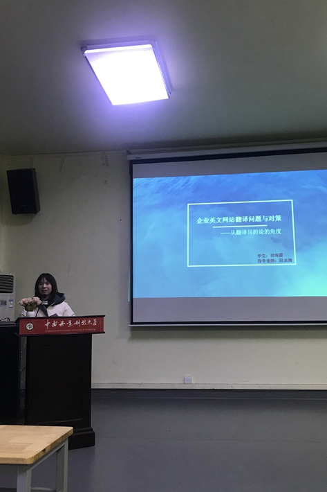 第二位主讲人胡培霞的主题是:目的论视角下企业英文网站翻译问题与对策。她从企业英文网站翻译的重要性出发,探讨了我国企业英文网站翻译的问题,然后从翻译目的论的角度分析出现问题的原因,以及在该理论指导下提出的应对策略,以提高企业英文网站翻译的质量,提升企业外宣的力度和效果。