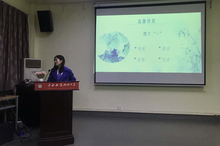 第一位主讲人孙粤霄的主题是:《英译中国现代散文选1》中数字成语的英译探析。通过对《英译中国现代散文选1》一书中数字成语的译法进行分析,总结数字成语的翻译方法和技巧,以期对数字成语的翻译有所助益。