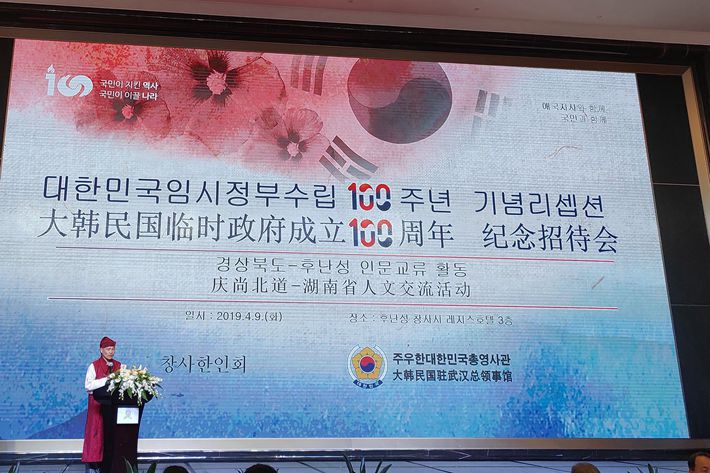 4月9日,由大韩民国驻武汉总领事馆举办的“纪念韩国临时政府成立100周年招待会”在长沙市瑞吉酒店举行,出席此次活动的人员有韩国驻武汉总领馆总领事金永瑾先生、湖南省外事办主任徐正宪先生、韩国著名独立运动家柳子明先生后裔柳展辉先生、长沙市韩人会会长高然才先生、长沙市各大媒体人士等,我院朝鲜语系系师生也应邀参加招待会。