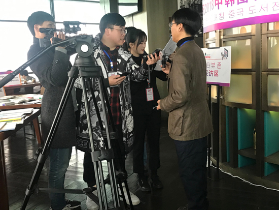 我院朝鲜语系15级、16级的郑铭颖、周佳妮、黄珍、王婷等10名同学在周禧玲老师的指导和带领下,担任本次中韩图书交易会的版权洽谈、来宾采访、图书介绍等中韩口译工作。