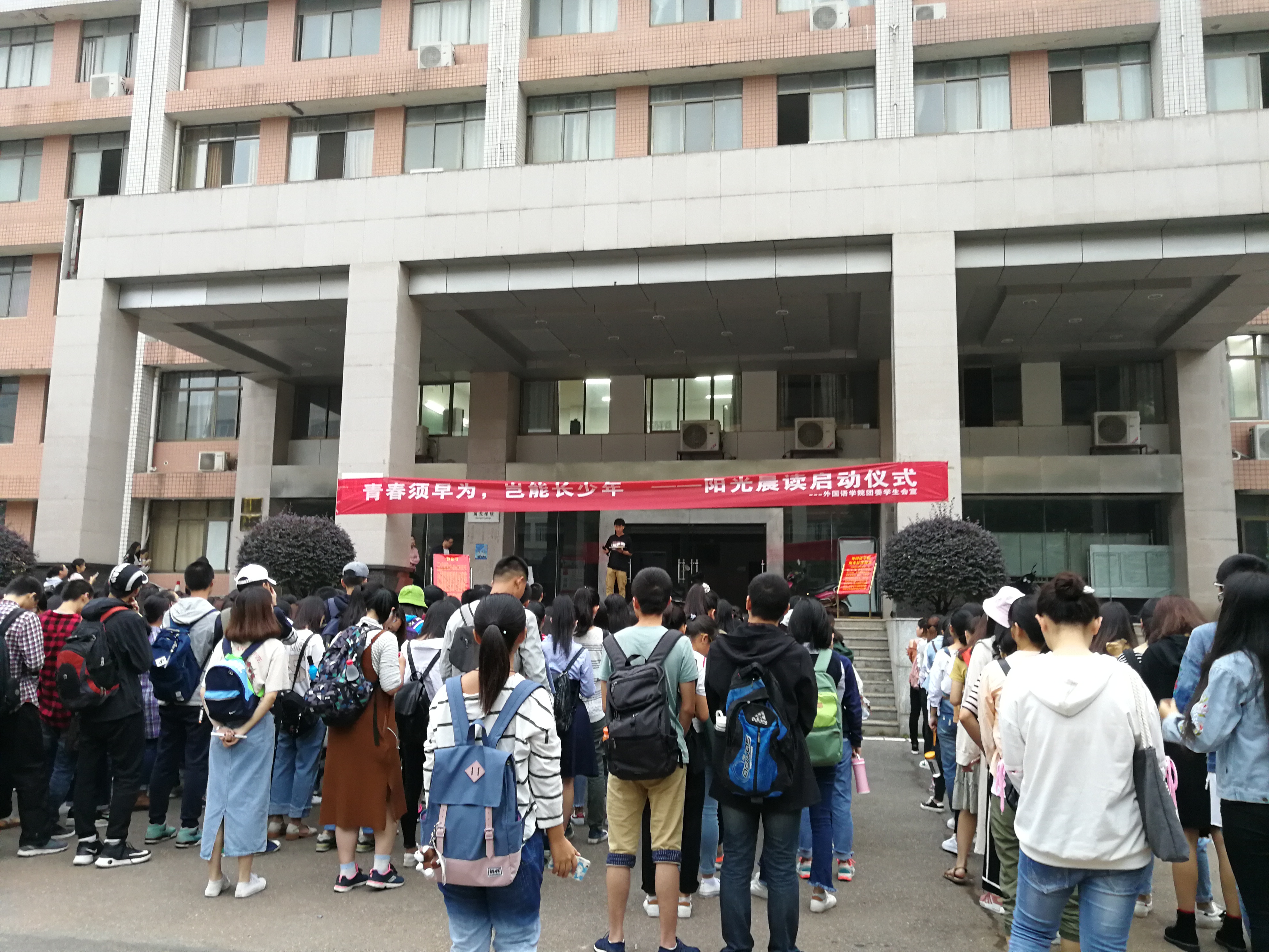 10月9日早7点,在清晨的徐徐微风中,外国语学院阳光晨读启动仪式在国际楼前拉开帷幕。外国语学院团委书记刘一波,学生会主席李文慧,学纪部部长玉成等出席了这次启动仪式。