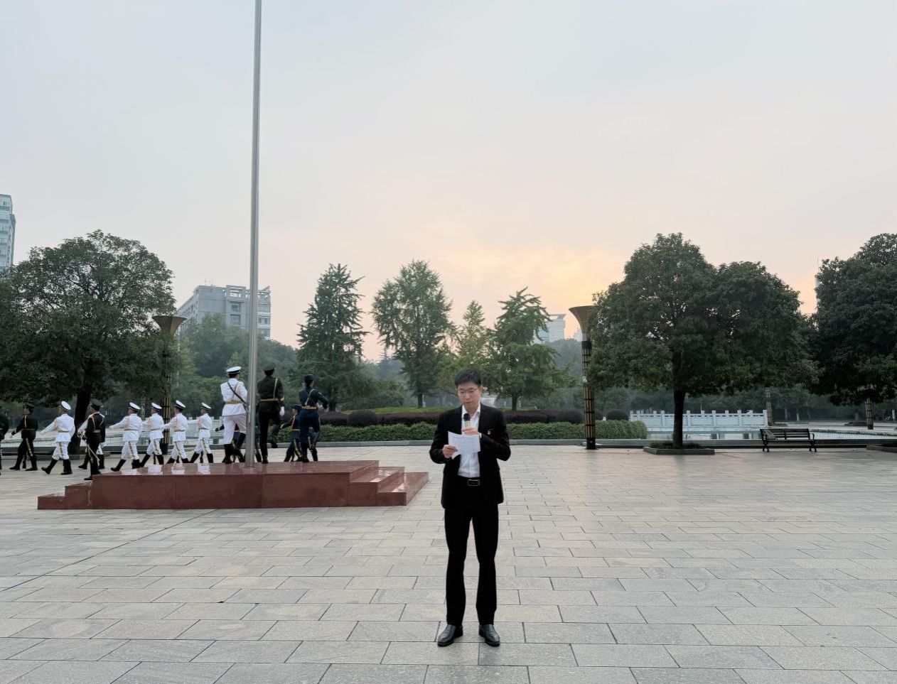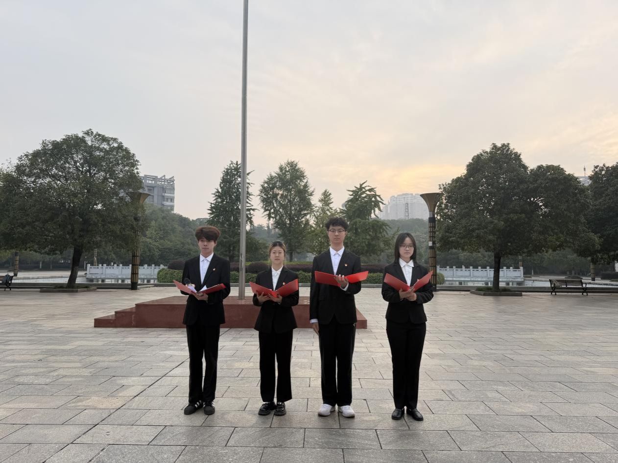 10月27日清晨6点50分,外国语学院“传承红色基因 涵养家国情怀”国旗下的誓言爱国主义教育活动于陶铸广场举行。学院副院长(主持工作)何敏、学院党委副书记何晓东、全体专职辅导员出席,全体学生党员、预备党员、入党积极分子及学院部分学生干部参加此次活动。本次升旗仪式由2024级邹乐同学主持。