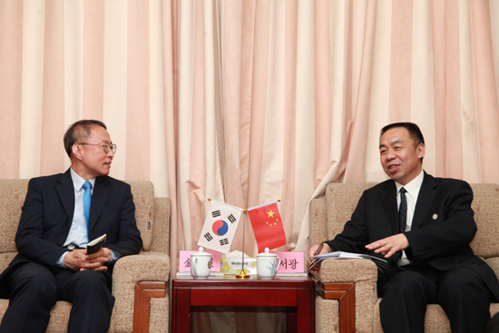 上午8点30分,大韩民国驻武汉总领事金永瑾先生一行抵达我校,我校副校长严曙光在崇德楼(行政楼)贵宾室与金永瑾就我校韩国语教育发展及现状、今后我校与韩国在外语教育、师资队伍建设、林业科技领域的交流等事宜进行了会谈。金永瑾表示今后将尽全力促进我校与韩国大学、知名企业、政府机构之间的交流。