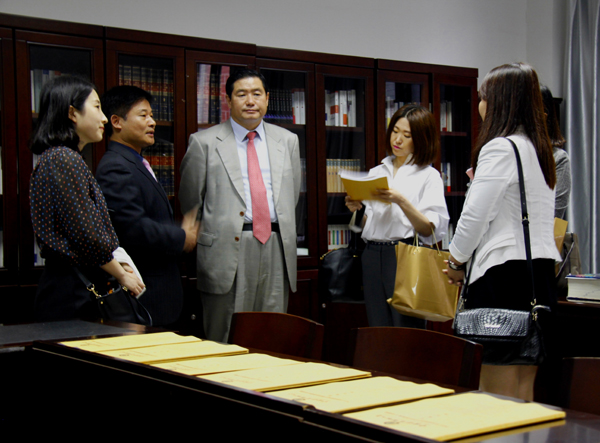 5月26日下午,韩国驻武汉总领事馆总领事郑载男先生一行莅临湖南省韩国文化研究与交流中心调研,我院副院长、中心常务副主任李应洪接待了来访贵宾。有朋自远方来,不亦乐乎?郑载男是我们中心的老朋友,2015年韩国驻武汉总领事馆成立五周年之际,我中心应邀参加了建馆庆祝活动。郑载男本次到中心调研,亦是兑现了去年馆庆之际中心对其邀请来访的承诺。韩国中心自2014年成立运行以来,第一次迎接韩国贵宾,自是喜气满满。郑载男非常关心我校朝鲜语专业和湖南省韩国文化研究与交流中心的建设,李应洪代表中心主任邓联健教授及朝鲜语专业表达了谢忱。李应洪向郑载男一行介绍了中心两年来的研究成果,并向客人介绍韩国友人捐赠的原版韩文图书。韩国驻武汉总领事馆文化教育处长李润姬看到我中心的研究报告后,顺手拿起表示要带走,李应洪慨然应允。看到简洁却布置齐整的中心办公室,郑载男面露会心的微笑。随行来访的还有韩国驻武汉总领事馆秘书崔海莲、行政员权郝旻,参加接待工作的还有我院朝鲜语专业教研室主任金京姬、李洪兰博士。