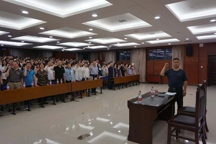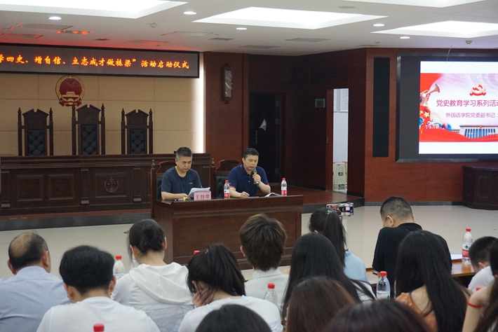 5月11日晚,外国语学院党委在博文楼一楼会议室举办“学四史、增自信、立志成才做栋梁”党史学习教育系列活动启动仪式,学院党委书记李鹏飞主持,环境学院党委书记刘光辉应邀作考研专题辅导报告,学院院长张沉香作专业报告,学院党委副书记张学兵作动员讲话。大会利用bilibili直播平台,采取线上和线下相结合的方式进行,学院党政班子成员、班主任老师、师生党支部书记、辅导员以及全体大三学生线下方式参加,大一、大二学生线上方式参与,全院共计1300余人参会。