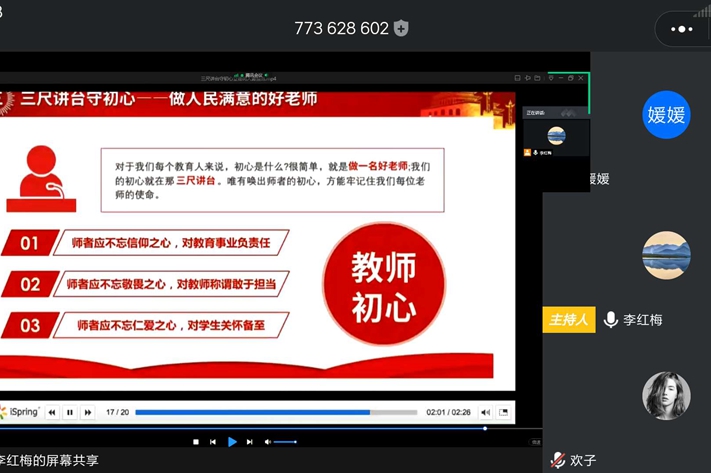 大学英语一党支部于6月16日下午采用腾讯会议和微信群的方式,召开了以“寻初心、守初心、践初心”为主题的党日活动。在支部书记李红梅的带领下,全体支部成员肃立,庄严地举起右手,郑重地宣读入党誓词。然后,通过腾讯会议分享屏幕,全体支部成员一起观看中国共产党党章的微课。李红梅结合微课,以“三尺讲台守初心,立德树人勇担当”为题,讲述作为共产党员的教师的初心和担当,给支部党员们上了一堂精彩、令人深受鼓舞的党课。她讲到不仅要做一名有信念、讲奉献的共产党员,更要心存感恩、爱岗敬业,三尺讲台守初心,做一名人民满意的好教师。师者要有仁爱之心,信仰之心,敬畏之心。党员同志们听完党课后,踊跃发言,积极交流学习心得,更加坚定了共产主义信念,坚定了奉献于党的教育事业的决心。