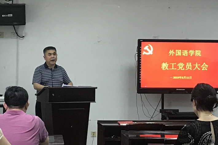 6月11日下午,外国语学院党委在知语楼102召开全体教职工党员大会,会议由党委书记李鹏飞主持。
