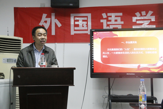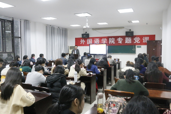 11月16日下午,学校党委委员副校长严曙光教授应邀为外国语学院师生党员和学校招投标处党员讲授题为“坚定文化自信,推动社会主义文化繁荣兴盛”的专题党课。参加听课人员有外国语学院党委班子成员、师生党员、学校招投标处党员。党课由外国语学院党委书记李鹏飞主持。