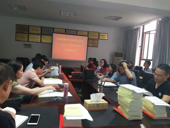 9月22日下午,外国语学院在外语楼2楼会议室召开了以“喜迎党的十九大,学习习近平总书记7月26日在省部级主要领导干部专题研讨班上的重要讲话精神(简称”7.26讲话”)和其他系列重要讲话”为主题的院中心组学习讨论会,学院党委班子成员、教工和学生党支部书记参加了会议,会议由院党委委员汤满意主持。