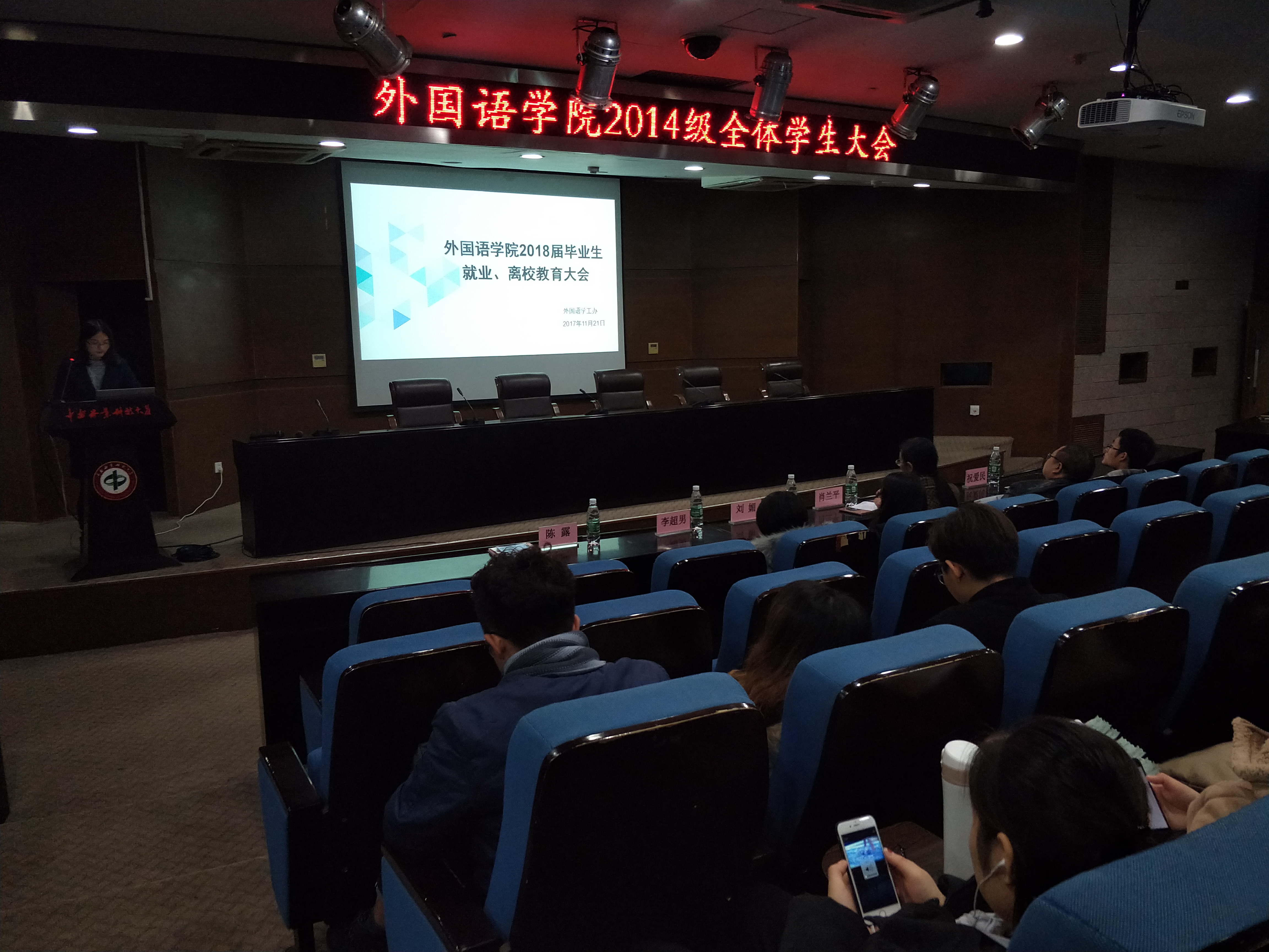 11月22日晚,外国语学院2018届毕业生教育大会在图书馆报告厅顺利举行。本次会议由2014级辅导员陈露主持,院党委副书记肖兰平、院团委书记刘一波、全体学工办老师及2014级全体学生出席了本次会议。