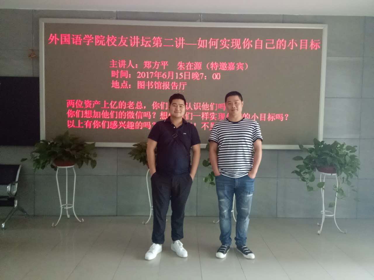 此次校友讲坛邀请到的主讲人是郑方平,外国语学院2006届日语专业毕业生,2006年毕业后去日本留学,2012年回国后自开始创办企业,主要从事日本市场跨境电商平台运作。朱在源,作为本次校友讲坛的特邀嘉宾,是郑方平校友的合伙人,回国后把“互联网+”思维模式营运到企业运作当中,是多个线上平台CEO,如今两人都已取得成功。郑方平首先分享了自己在日本的留学经历,从学校到社会的转变和走上创业的故事,告诉我们要有勇气和胆量接受挑战,学会忍受孤独,发现机会并马上行动,开始动手;作为高校大学生怎么规划自己的大学生活,结合自己兴趣爱好给自己定目标。同时表达了在我院建立校企合作新模式,创立欢乐工作室的目的,不仅仅是为了回馈母校,更多是的让外国语学院的同学们从校园开始就要有危机感,提前感受职场,提高动手能力,提前为今后的就业、创业做好准备。接着,朱在源也讲述了他在美国的求学经历,启示我们,想把人生过的更精彩就要克服孤单,勇于挑战和尝试。随后,两人开始与学生面对面交流,并建立长期的微信联系,以便可以外国语学院的同学进行长期的指导。