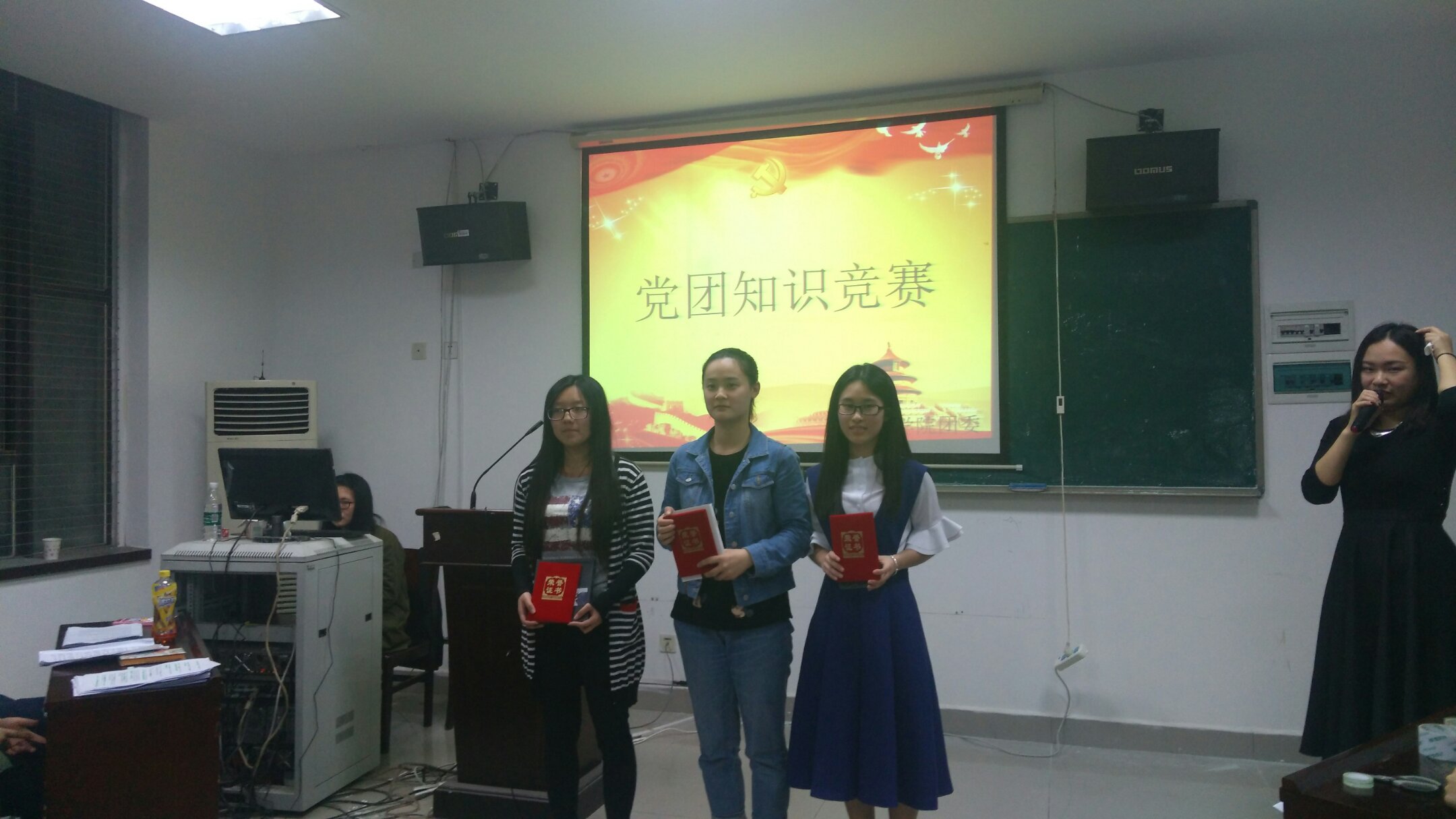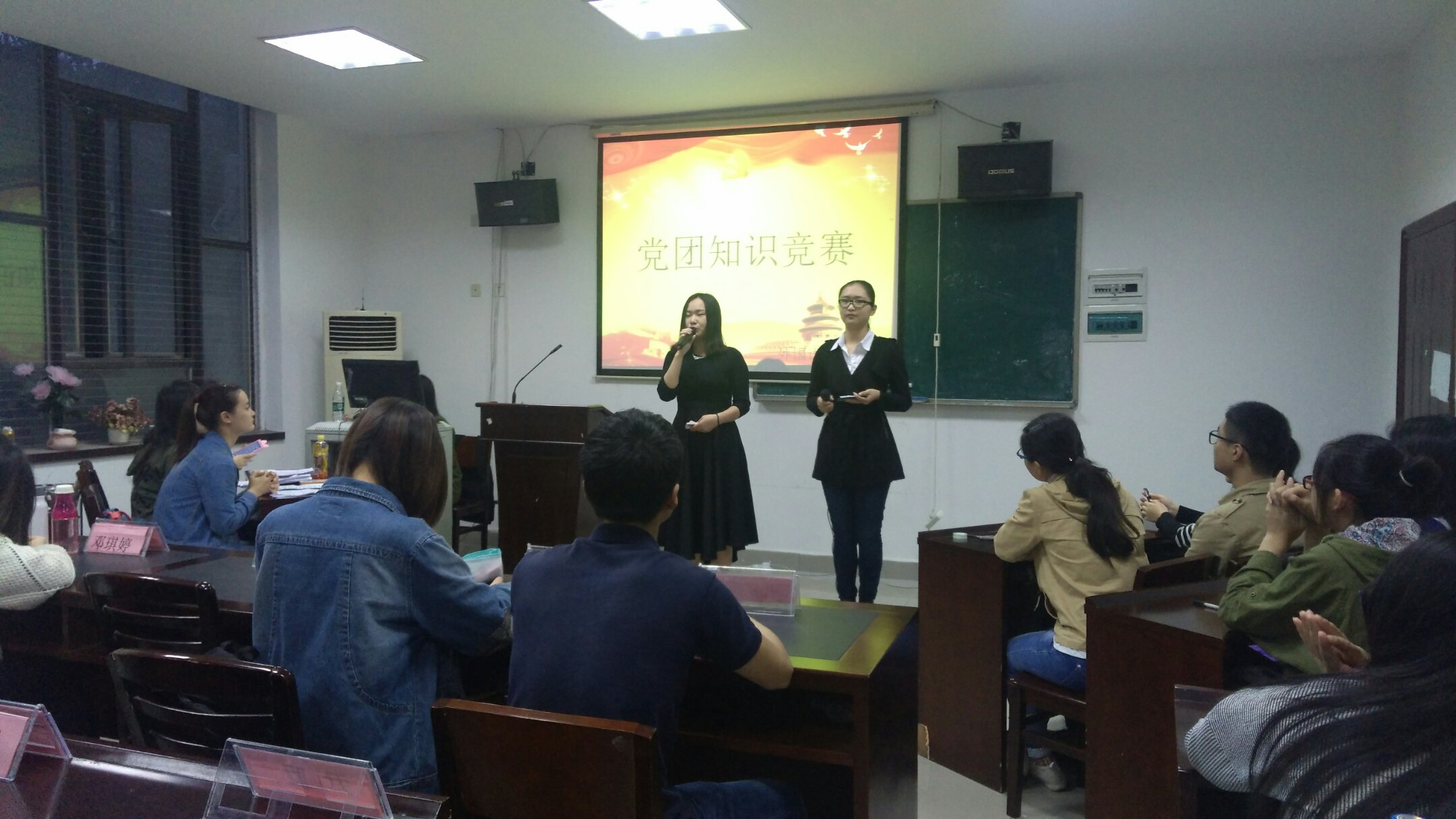 2016年4月24日晚7点,由外国语学院团委组织部承办的党团知识竞赛决赛在外语楼102b隆重举行。此次比赛由组织部两名干事主持,主席团成员亲临现场为同学们加油鼓劲。
