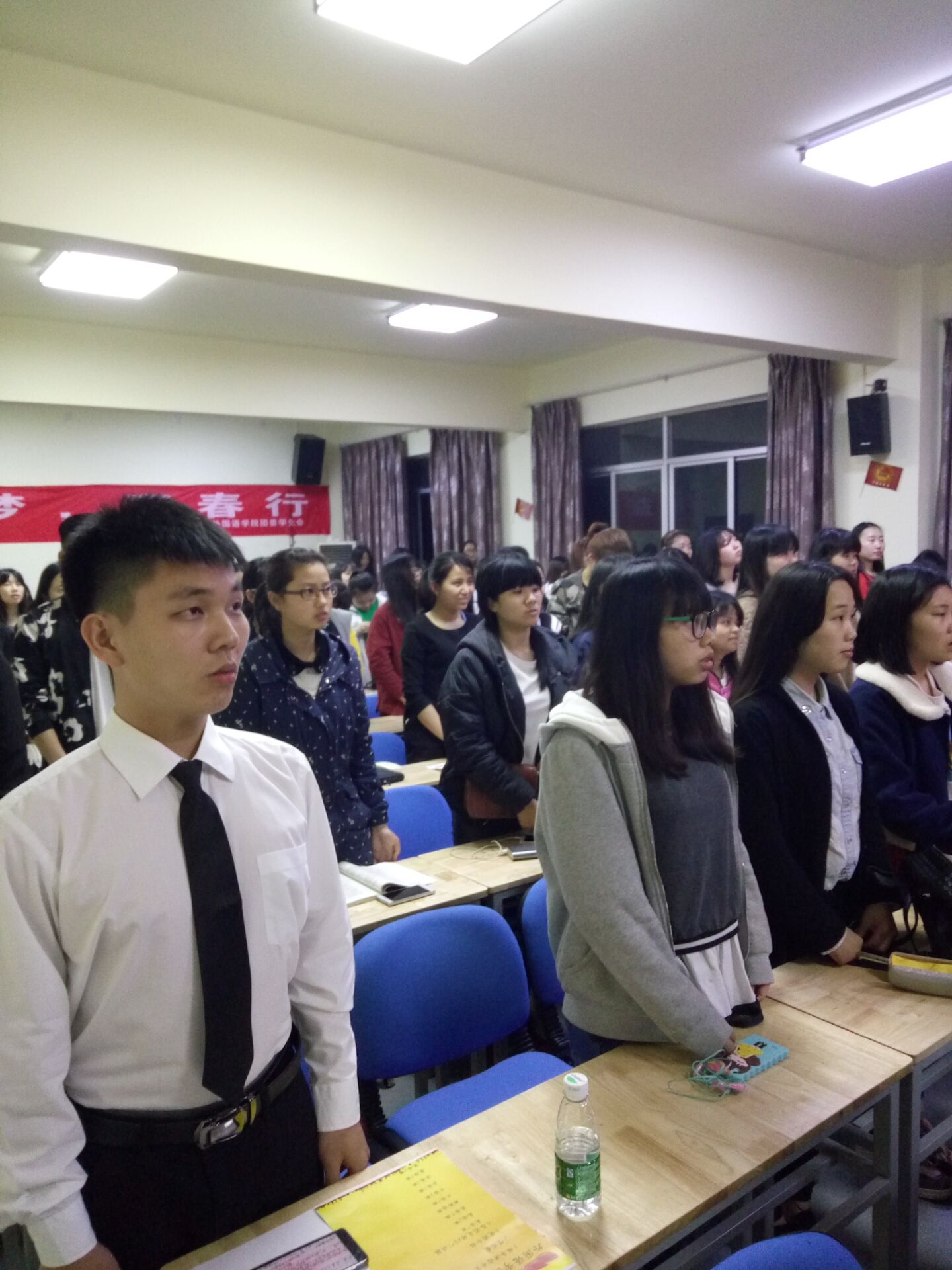在整齐嘹亮的中国共产主义青年团团歌声中,此次团建月开幕式拉开了帷幕。首先,我院2015级各班团支书对各自的班级概况、班委构成、班团活动以及团建月目标作了简短演讲,由此也展示了各班的特色。其中,英语三班提出的“未来不闲置”的口号让人为之振奋,朝鲜语一班“乐观又不失认真”的态度也让人眼前一亮。日语二班也不逊色,“宥于一班,珍惜记忆与陪伴”的班级寄语正体现了这一个整体的团队精神。法语一班和二班高度注重公益事业,他们珍惜着每一个献爱心的机会并相信相遇是命运的馈赠,正如两个俄语班级团支书所言,我们相聚是一场美丽的际遇,“薄年相伴勿相忘”。最后由庞铭老师为此次开幕式致辞,她强调了公益的重要性,并用她的亲身感悟来号召同学们参与公益事业。