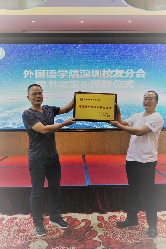 7月15日,外国语学院深圳校友分会在深圳正式成立。外国语学院党委书记李鹏飞,副院长黄宇驰,学工办、院团委书记刘一波,英语系邓永桂老师,日语系杨艳萍老师,法语系刘洋老师代表学院出席了成立大会,大会由2007级校友李伶俐和刘一波老师主持。
